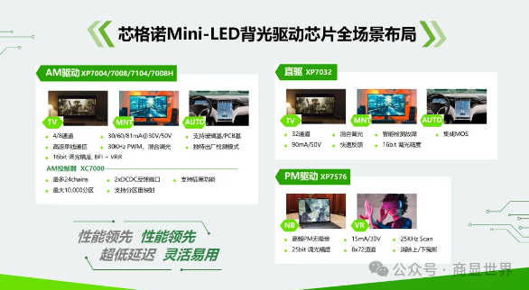 芯格諾擁有整建制研發(fā)團(tuán)隊(duì)和全流程的芯片研發(fā)能力,并有著十余年的深厚技術(shù)積累,在Mini LED背光驅(qū)動領(lǐng)域進(jìn)行了“多技術(shù)、全場景”的研發(fā)布局,在AM(主動式)、PM(掃描、直驅(qū))技術(shù)路線上都有相應(yīng)產(chǎn)品開發(fā),可覆蓋TV、Monitor、Notebook、Tablet PC、VR、車載顯示等多種場景,產(chǎn)品性能領(lǐng)先。