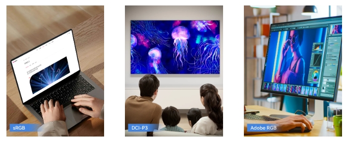 "三百"色域顯示屏,指的是擁有三種sRGB 100%、DCI-P3 100%、Adobe RGB 100%的高色域顯示的屏幕。其中,sRGB色域廣泛應用于互聯網和數字媒體,DCI-P3則常用于影視制作和激光光學投影,而Adobe RGB則更加適合專業圖形設計,三種色域各有千秋,但是常規的"三百"色域顯示屏,用戶需要手動切換調參數,整個過程繁瑣且不易掌控。