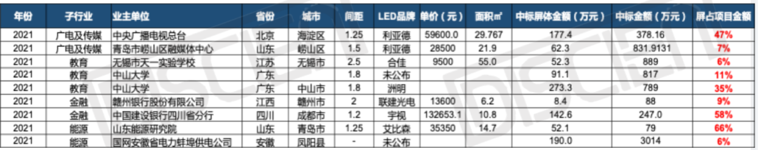 透過迪顯(DISCIEN)招投標數據庫展示一組數字,更好說明企業為何要向下求索:在2021年LED招投標數據庫中隨機抽了幾個有代表性的行業(廣電、教育、金融、能源),其中可以看到屏金額在整體項目中的金額占比,在中標金額500萬以上的大項目中,屏占比較低,基本是10%左右,商顯由于項目分散性,一直依托于分銷、集成商,企業直銷比例較低,也抑制了企業向下求索的更多可能性。